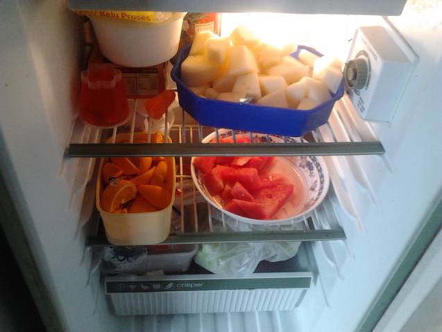 A full and healthy fridge. MIL is a mother of 4 grown up children of which all are already in the 20s. And yet she still loves them like kinder kiddies. Fruits cut up, iced, ready to eat. *heart*